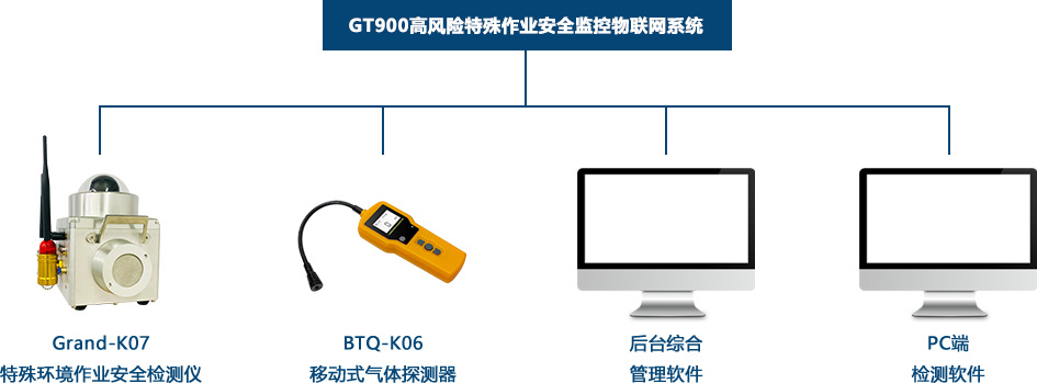 GT900高风险特殊作业安全监控物联网系统主要用于高风险特殊作业过程的实时监测监控,与其它环境感知装置如固定式气体探测器、视频监控设备、移动式气体和温湿度探测器等互为补充,构建多维度、全天候的安全监控监测机制。系统通过集成视频采集、有毒有害气体监测的多功能监控设备及系统,实现智能报警和联动、设备定位及轨迹查询功能。在发生事故时可快速人员定位进行救援,提高风险监测监控、预警判断的应急处置能力和效率,从而解决重大高风险特殊作业尤其是受限空间作业监测监控困难的问题,对于保障特殊作业安全生产具有非常重要的意义。 GT900高风险特殊作业安全监控物联网系统由Grand-K07特殊作业环境安全检测仪、BTQ-K06移动式气体探测器、后台综合管理软件、PC端检测软件等组成。