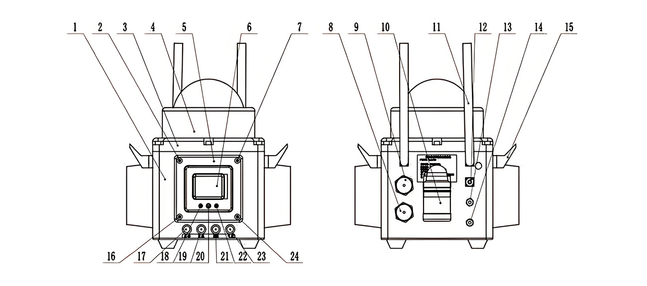 序号 名称 序号 名称 序号 名称 序号 名称 1 壳体 2 磁性按键“ESC” 3 上盖 4 透明罩外壳 5 屏幕固定壳 6 显示屏 7 磁性按键“+” 8 LAN口 9 充电口 10 声光报警器 11 天线 12 天线座 13 快速接头PC4-M8*1 14 堵丝 15 把手 16 磁性按键“SET” 17 启动键 18 运行指示灯 19 关机键 20 红外遥控接收头 21 SOS键 22 报警指示灯 23 气泵键 24 磁性按键“-” 设备按键说明