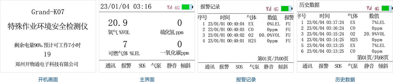 序号 气体名称 检测范围 单位 传感器原理 采样方式 报警方式 1 可燃气体 0~100 %LEL 红外 自然扩散或泵吸 独立声光报警 震动报警 显示屏视觉报警 浓度报警 故障报警 2 氧气 0~30 %VOL 电化学 3 一氧化碳 0~100 ppm 4 硫化氢 0~100 ppm 5 氯气 0~20 ppm 6 氨气 0~100 ppm 7 二氧化硫 0~50 ppm 8 二氧化氮 0~100 ppm 9 光气(碳酷氛) 0~20 ppm