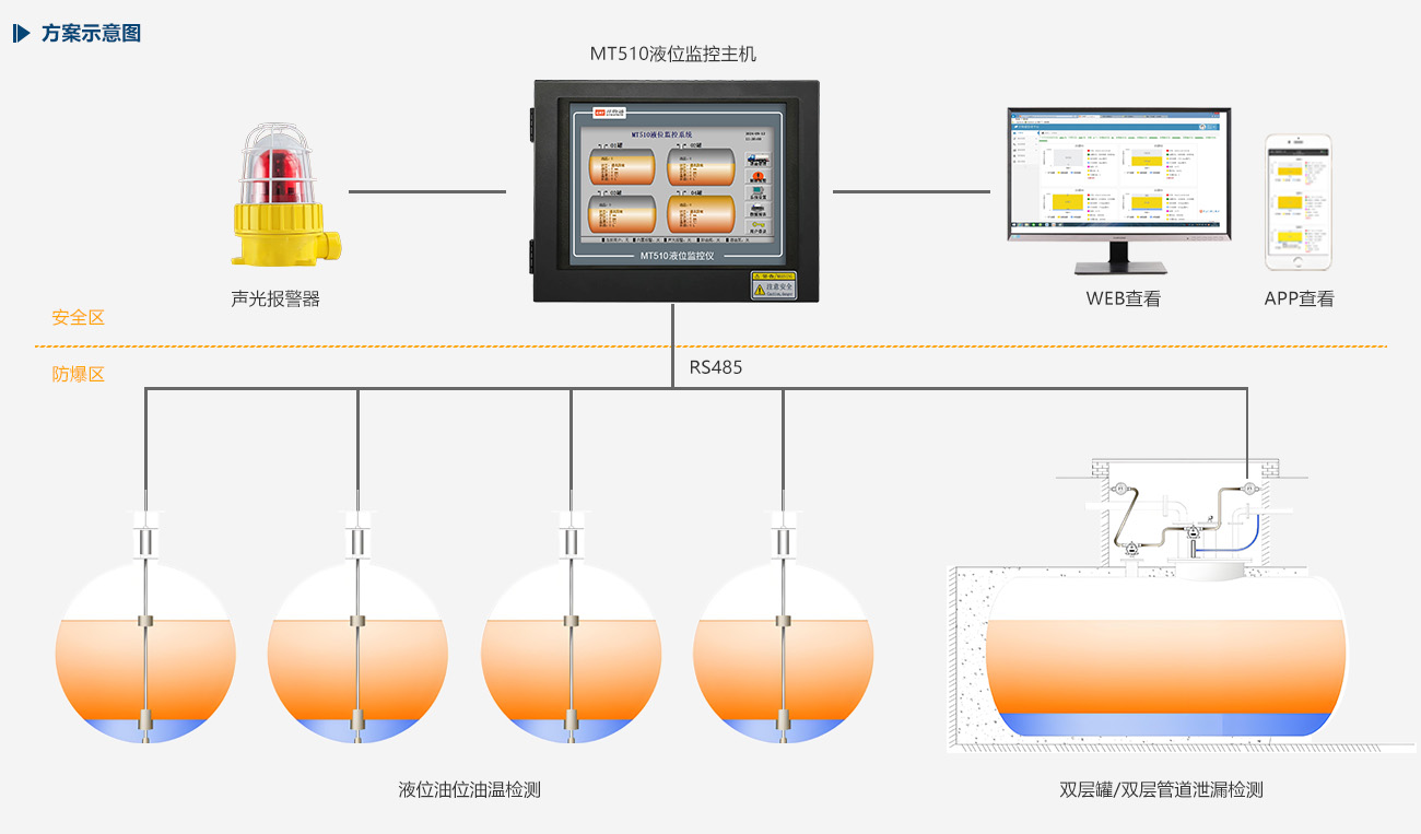采用MT510液位监控仪作为核心控制单元,连接CRT-M5磁致伸缩液位计(精度±0.1mm)实时采集油罐液位、油水界面及多点温度数据。系统通过RS485总线实现数据交互,支持三级预警机制:当液位超出预设阈值(高低限值可自定义)时,触发声光报警器(120dB蜂鸣+红色频闪),同步推送报警信息至PC端监控软件及手机APP。
