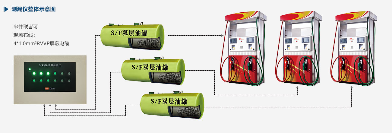 双层罐(管道)泄漏检测仪,可同时满足加油站双层管道、双层油罐渗、泄漏检测的需要,产品采用总线式设计,可将管道检漏探杆和油罐检漏探杆接至同一根总线上,并可在一个集中声光报警箱(控制台)上同时显示管道和油罐的泄漏情况。避免油品损失和油品对环境污染的同时,节约施工时间、降低布线成本。