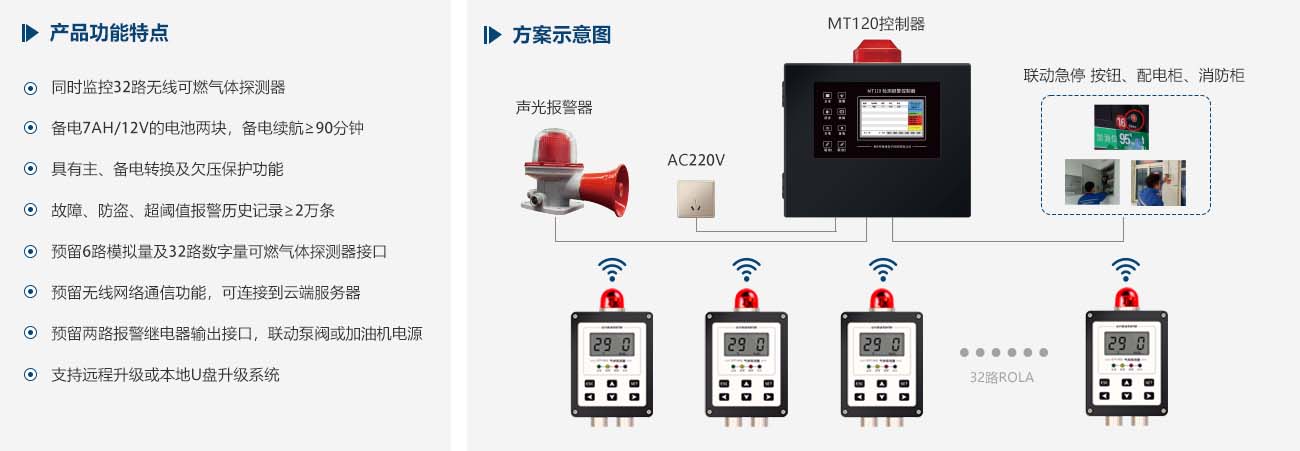 为满足加油站对安装可燃气体报警装置的需求,开物通公司深入研发,全新推出了磁吸安装、无线通讯、本质安全型系列可燃气体探测器。搭配基于AQ3010-2022《加油站作业安全规范》的标准MT120可燃气体检测报警控制器。