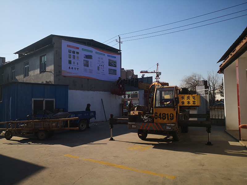 经过双方企业的积极沟通、精心设计、增删筛选,广告设计终于诞生。接下来的任务便是展示。由于广告墙体实际情况的特殊性,顶部为彩钢结构,导致安装师傅无法用正常方式施工。在零下9℃的严寒天气中,钢架较大,普通工具难以完成,高空作业的难度增加。