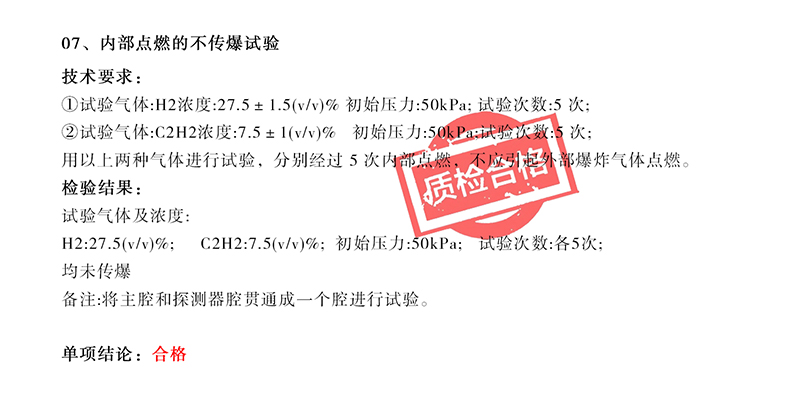 产品经过多轮测试和评估,所检产品均符合GB/T3836.1-2021、GB/T3836.2-2021标准,判定为合格。同时检测表明,我司探测器不仅在防爆性能方面表现出色,在其他各项性能指标上也均达到了或超过了相关标准和要求。